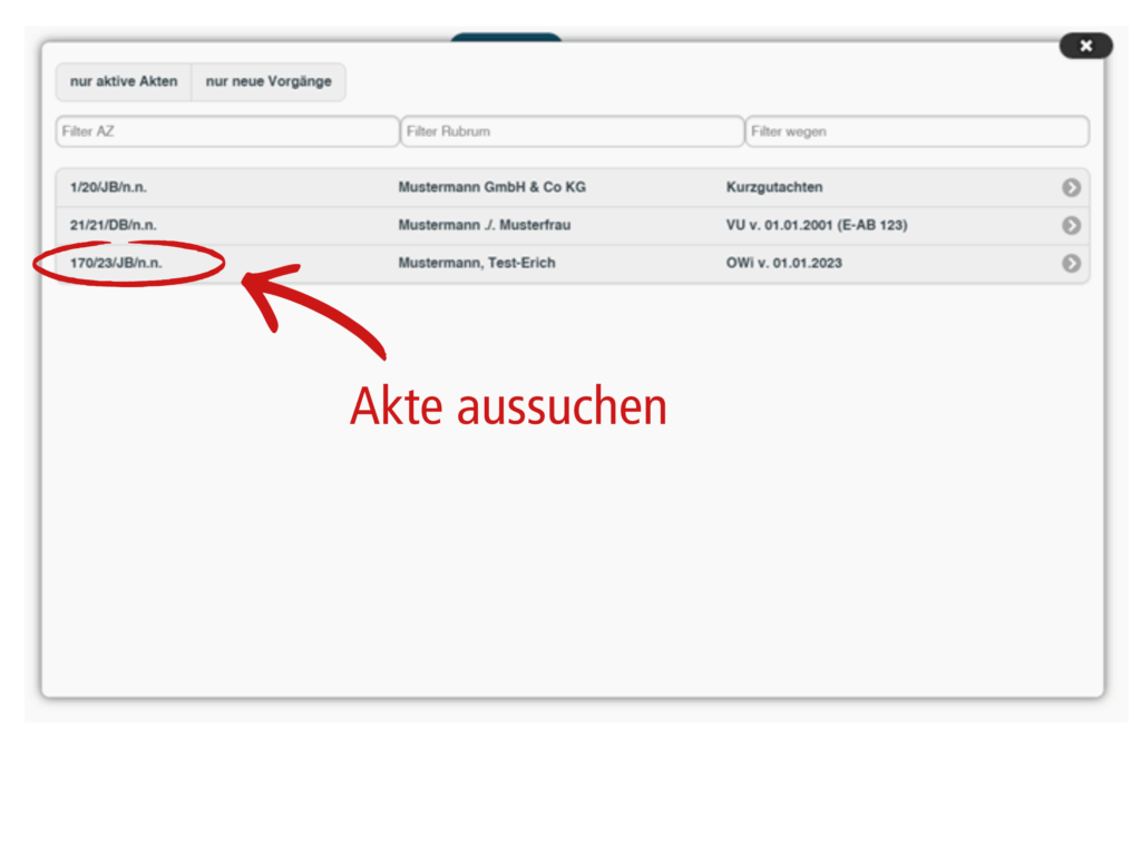 In der zentralen Übersicht sind sämtlicher Akten aufgelistet. Hier können Sie gezielt nach unterschiedlichen Parametern ihre Akten filtern und suchen. Mit nur einem Klick erhalten Sie die vollständige Detailansicht jeder einzelnen Akte und den aktuellen Status der Bearbeitung..