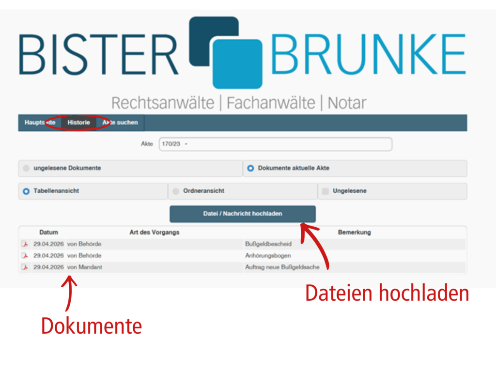 In der Historie bilden wir den gesamten Lebenszyklus Ihrer Akte ab. Jedes Dokument, das unser Haus verlässt oder uns erreicht, wird hier für Sie hinterlegt. Das Ziel: 100 % Transparenz ohne Rückfragen.