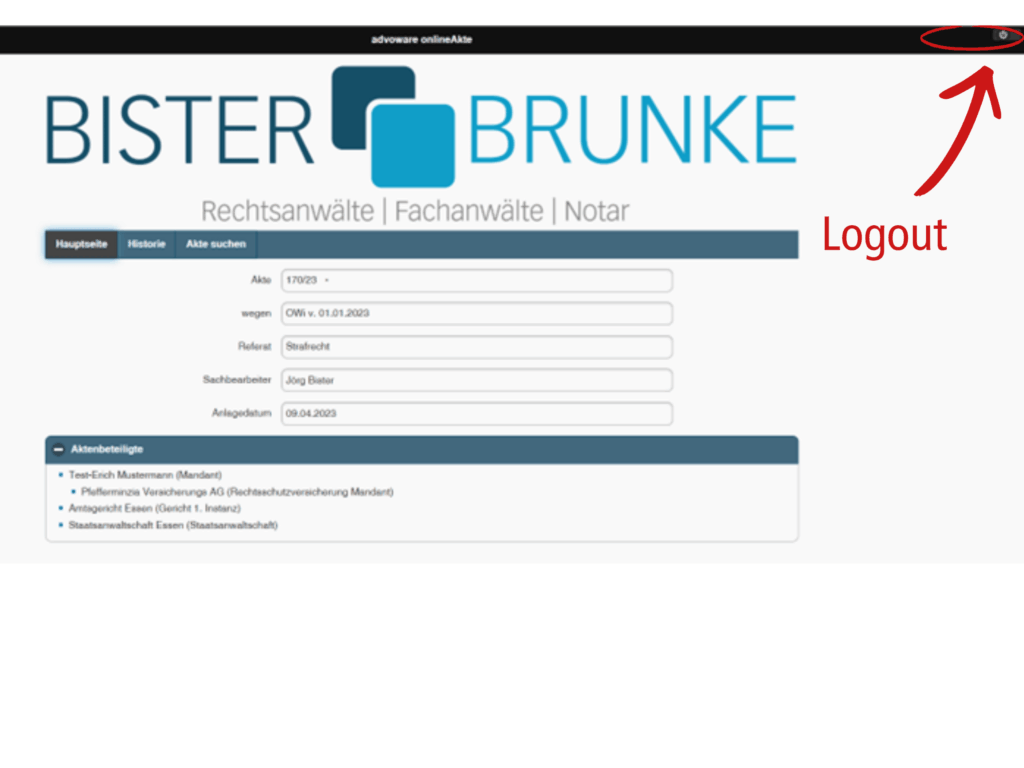 Mit einem Klick auf ‚Logout‘ beenden Sie Ihre aktuelle Sitzung. Wir empfehlen diesen Schritt insbesondere bei der Nutzung an öffentlichen Geräten oder geteilten Arbeitsplätzen, um Ihre vertraulichen Akteninhalte optimal zu schützen.